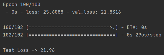 성능 평가 결과 : 21.96은 검증 데이터로 인한 손실인 val_loss : 21.8316 에 매우 근접한다.